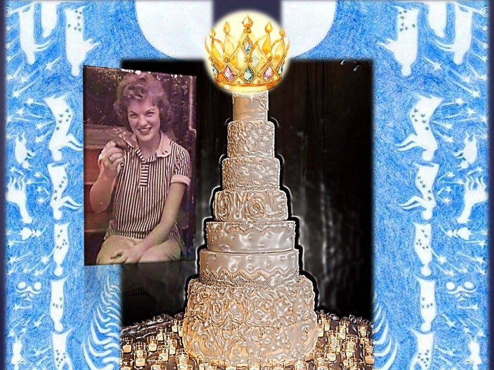 She stood off to the side of the dance floor, looking out a curved bay window, at a calm light blue sea. Her strawberry blond hair teased up in a beehive as high as the cake, perfect bangs framing her hazel-green eyes – tawny orange freckles on her high Irish/Chickasaw cheek bones.