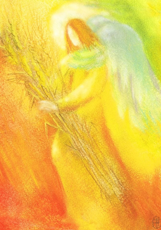 Reap with her, the ripened ear of grain – feel the golden sheath pierce the sacred heart of the Rosy Cross – a Willing Sacrifice to Love - And a Spiritual Reproduction - the lower nature crucified - to allow the Higher Life to germinate & bear fruit.
